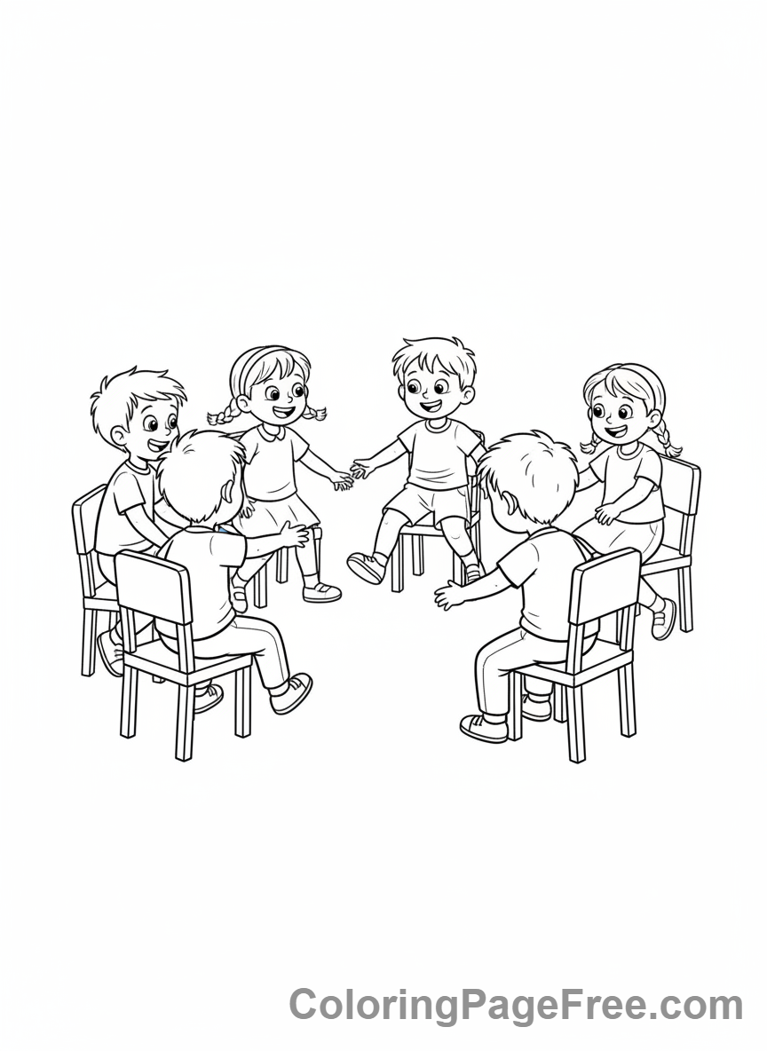 Party coloring page – Kids playing musical chairs