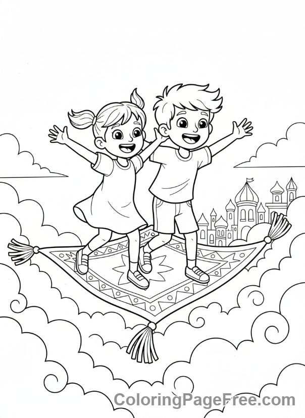 Storybook coloring page – Kids flying carpet