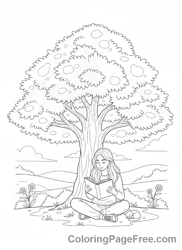 Teens coloring page – Teen girl reading tree